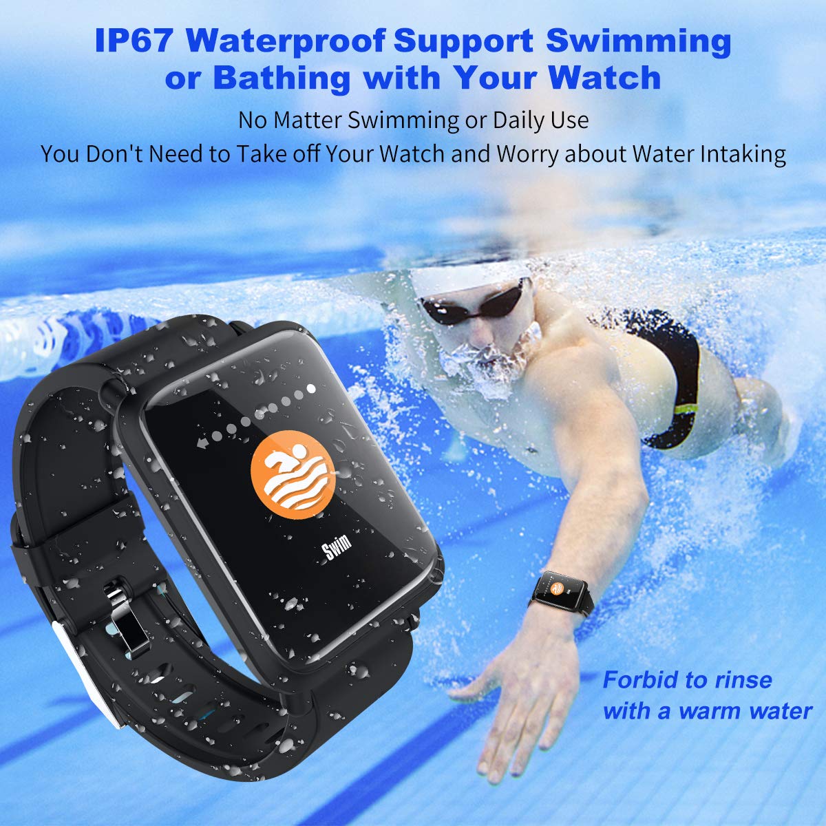 ★IP67 Waterproof SmartWatch with 1.3" Colorful Screen: The fitness tracker adopts high-quality waterproof material.and up to IP67 waterproof standard. Free replaceable wristband makes your everyday workout stylish. Protect this lightweight activity tracker watch from damage in water, rain or sweat. (Allowed for swimming, not for diving or taking a hot shower).Which shows the new fashion trend with its 1.3" HD TFT LCD color display screen. Press the touch key to switch the colorful displays.